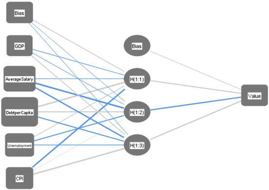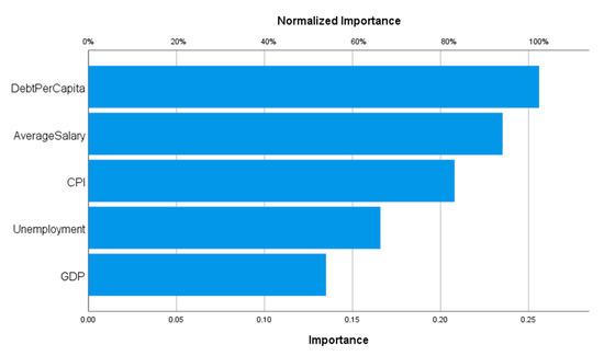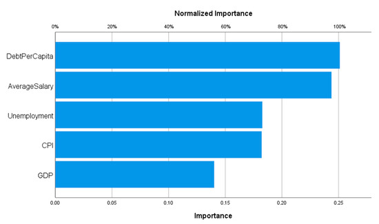 As in the previous case, once the network is trained, we can observe the importance of the independent variables within the network (Figure 6): for the GDP the importance is 14.0%, the average salary has an importance of 24.4%, the Debt Per Capital 25.1%, the Unemployment 18.3%, and finally the Consumer Price Index 18.2%.