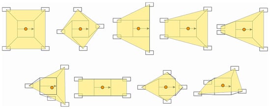The system is tested and developed using the rover SherpaTT that is shown in Figure 1. SherpaTT was built by DFKI for long-distance exploration applications [26], negotiation of highly challenging terrains or non-nominal conditions (sinkage in soft soil, getting entangled between rocks or alike), cooperation tasks between heterogeneous rovers in a collaborative sample return mission, search and rescue and/or security missions. SherpaTT is a four-wheeled mobile robot [27] outfitted with an actively articulated suspension system, independent drive and steer wheel motors and a six degrees of freedom (DOF) manipulation arm. The rover is also a hybrid wheeled-leg rover, so it can take advantage of both wheeled and legged locomotion according to the terrain difficulty. SherpaTT has a mass of about 166 kg and a payload capacity of at least 80 kg. Each of the four suspended legs has five DOF that include the rotation of the whole leg about the shoulder or pan axis with respect to the robot body, the two rotations of the inner and outer leg parallelograms, the steer and drive angle of the wheel. SherpaTT’s footprint can vary between 1 × 1m in a folded configuration to 2.4 × 2.4 m in a maximum square footprint. Various predefined footprint shapes (stances) can be adopted as explained in Figure 2.