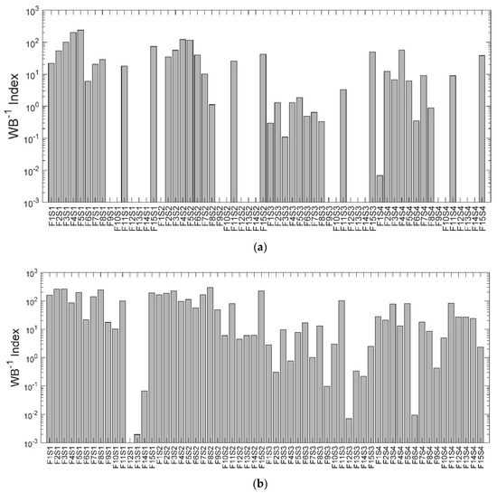 Figure 3 and Figure 4 show, respectively, the and indices values for all the statistical features computed both on terrain and slippage labelled datasets. Some features are missing because the correspondent sensor suite is not available in the classification dataset (please refer to Table 1).