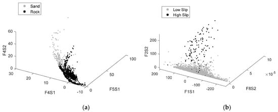 3D plot of the first three most relevant features selected for terrain (a) and slippage (b) classification.