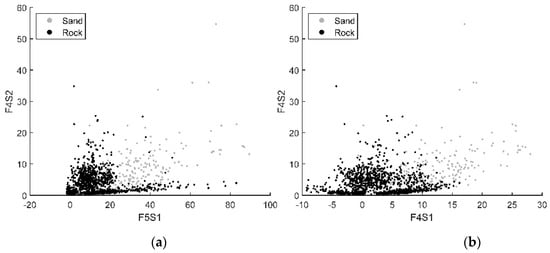 2D distribution of the most relevant features selected for the terrain classifier: F4S2-F5S1 plane (a), F4S2-F4S1 plane (b).