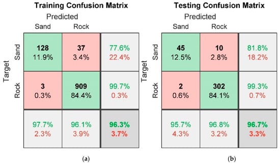 Confusion matrix for training (a) and testing (b) of the terrain classifier.