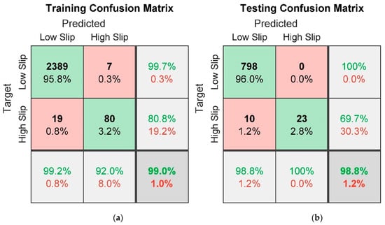 Confusion matrix for training (a) and testing (b) of the slippage classifier.