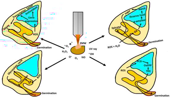 Plausible events of seed germination initiated by plasma seed priming. Plasma treatment causes mechanical damage and facilitates a redox environment for the seed. This redox environment induces different pathways of seed germination. EMW: Electromagnetic wave, GA: Gibberellic acid, MAPK: Mitogen activated protein kinase, OxPPP: Oxidative pentose phosphate pathway, PCB: Protein carbonylation, TRX: Thioredoxin.
