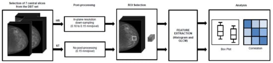 We considered the craniocaudal (CC) view for each DBT image set, focusing the analysis on 7 slices at the center of the imaging study (Figure 1). Our choice was guided by Kontos et al., who suggested insulating the fibro-glandular tissue for feature extraction as superficial layers (skin and subcutaneous fat) only act as anatomical noise and are not correlated with breast cancer risk [11]. This choice is particularly relevant for small-sized breasts, as the number of slices in a DBT set is a function of breast thickness. Furthermore, preliminary analysis showed that mean feature values were not influenced by increasing the number of considered slices in large-sized breasts (data not shown). In order to apply a coherent texture analysis and insulate the effect of the acquisition angle, an in-house program developed in MATLAB (MathWorks, Inc., Natick, MA, USA) was used to downsample the in-plane resolution of HR images to the in-plane resolution of ST images, i.e., from 0.1 to 0.15 mm/pixel. The downsampling was performed using nearest-neighbor interpolation to maintain the integrity of original data and avoiding generating fictitious pixel values [18,19,20]. A region of interest (ROI) of 256 × 256 pixels was placed behind the nipple (Figure 1). This combination of ROI size and position was previously reported to have the highest discrimination power with regard to texture performance in DM [8,21] and in DBT [12]. Furthermore, the ROI size is a trade-off between different needs. In fact, the ROI size used in the present work is defined to include the limited parenchymal area of small breasts and is assumed standard for all breasts to avoid potential biases in the features’ calculation. Feature computation was performed for each ROI in the 2D mode with MaZda software package [22]. We considered first-order features based on the image gray levels histogram and second-order features based on the gray level co-occurrence matrix (GLCM) [1,23] (Table 1). GLCM features were extracted using first-order neighbors and 0°, 45°, 90° and 135° directions. Feature values extracted from each slice were averaged into a single value. The same averaging operation was performed for the feature values obtained along the different GLCM calculation directions (0°, 45°, 90° and 135°). With these averaging operations, a single value for each feature was associated with a single DBT image set. Descriptions and mathematical details of the relevant features for this study can be found in Supplementary Materials.