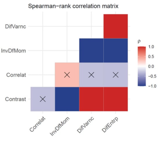 Spearman rank correlation matrix for features showing a significant difference between 15° acquisition angle (standard mode) and 40° acquisition angle (high resolution mode) DBT images. Red and Blue elements indicate a positive and negative correlation, respectively, with a significance: p < 0.001. Crossed elements indicate that the correlation is not significant p > 0.05.