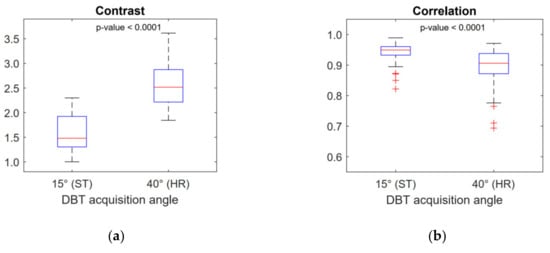 Boxplots of the non-correlated features Contrast (a) and Correlation (b). These features show a significant difference between 15° acquisition angle (standard mode) and 40° acquisition angle (high resolution mode) DBT images.