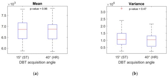 Boxplots of Mean (a) and Variance (b) histogram-based features. These features show no significant difference between 15° acquisition angle (standard mode) and 40° acquisition angle (high resolution mode) DBT images.