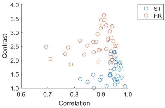 For a single DBT image set, feature values deviated within <1% from the value averaged over the slices and over the GLCM direction calculation. This low deviation justified taking the average value for each feature, corresponding to a single DBT image set. A total of 15 features were extracted and five of them (all belonging to the second-order group, i.e., GLCM features) showed significant differences between ST and HR images (see Table 2). The scenario was unchanged when the analysis was repeated after varying the bits’ resampling amplitude (i.e., 5-bit, 6-bit and 7-bit). The correlation matrix of the features showing a significant difference between ST and HR images is reported in Figure 2. The Correlation feature was not correlated with any other feature. The Contrast feature was strongly correlated with other features (Spearman-ρ = ± 0.99 with a p-value < 0.001) except the Correlation feature (Spearman-ρ = 0.31 with a p-value = 0.14). Again, this scenario was unchanged for 5-bit, 6-bit and 7-bit resampling amplitudes. For this reason, further analysis only took into consideration the not correlated GLCM features, Contrast and Correlation. Figure 3 shows boxplots comparing these features in ST and HR images. Figure 4 contains boxplots of Mean and Variance features that showed no significant difference between ST and HR images. Finally, in Figure 5, we show the differences between ST and HR in 2D space employing the two most relevant features.