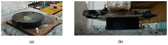 A highway reinforced concrete continuous T-girder bridge with 4 × 20 m spans was taken as the prototype bridge. The scale of the bridge was reduced considering the comprehensive factors such as test conditions and reliability of test results. Finally, a two-span continuous girder bridge specimen with a geometric similarity ratio of 1:3 was made and tested using the shaking table array system (see Figure 3). There were two kinds of bearings: ordinary laminated rubber bearing and high damping rubber bearing, as illustrated in Figure 4 The seismic response of the bridge specimen on two supporting conditions were tested respectively [43].
