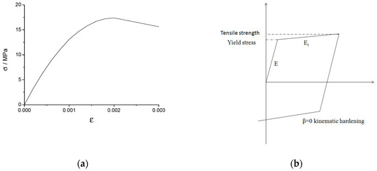 LS-DYNA software [36] was used to study the failure process of continuous girder bridge specimen under seismic action. The concrete was simulated by solid elements. The cube compressive strength of the concrete was 32 MPa and uniaxial compressive strength was 23 MPa. The uniaxial tensile strength of the concrete was 2.24 MPa while elastic modulus was 2.75 × 104 MPa. The material number of concrete was Mat_024, which was an elastoplastic material with an arbitrary stress-strain curve (see Figure 5a). If the compressive strain reached 0.0033 or the tensile stress reached 2.24 MPa, the concrete would fail. The material number of the steel bar was Mat_003, which had a bilinear kinematic hardening (see Figure 5b). E and Et were the slopes of the bilinear stress-strain curve. Specific parameters are shown in Table 2. The connection between steel bars and concrete was simulated by common nodes, without considering the slip and fracture of steel bars. The counterweight block was specified as mass elements which were assumed to be lumped at the nodes, and each mass node was 9.3 kg weight.