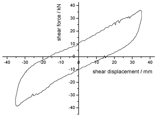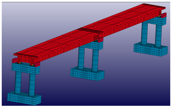 To model the HDR bearing, solid elements and discrete spring elements were used. The material numbers of the vertical discrete spring element and horizontal discrete spring element were MAT_S01 and MAT_S03, respectively. The vertical stiffness of the side bearing and middle bearing were 1 × 105 kN/m and 4 × 105 kN/m, respectively. The horizontal constitutive relation of the HDR bearing has been tested [42] and illustrated in Figure 6. The longitudinal stiffness and transverse stiffness of the steel plate fixing the middle bent were 3 × 103 kN/m and 600 kN/m, respectively. The steel plate would fail if the shear force exceeded the ultimate shear force (40 kN). The bearing would slide when the sheer force of the support was more than the static friction. Contact simulation was used as the interaction between the pier and the girder after the bearing slid. The static and dynamic friction coefficients were 0.3 and 0.15, respectively. Figure 7 shows the finite element model.