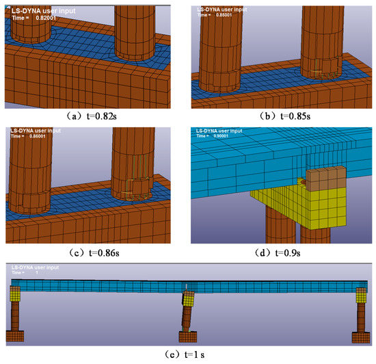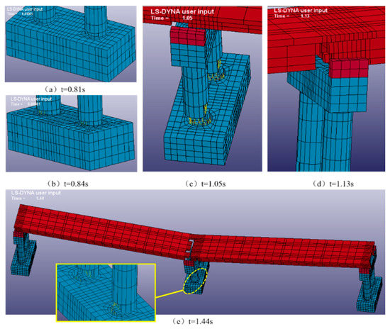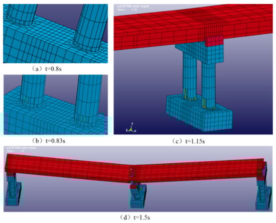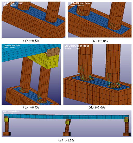 There damage and destruction phenomena in the bridge specimen under the longitudinal 2.0 g PGA wave of El Centro is shown in Figure 12. First of all, the failure of steel plates appeared at 0.61 s. The bottom of the concrete middle pier was crushed at 0.8 s. When the time was 0.83 s, the bearing on the middle pier failed and the bottom of the middle pier continued to damage. The bottom section of the middle pier completely failed and had obvious deflection at 1.15 s (see Figure 13). The two-span continuous girder became a simply supported girder, for the main beam lost its vertical support from the middle pier. Then cracks occurred on the bottom of the main girder near the middle bearings. When the time was 1.5 s, the main beam in the vicinity of the middle pier was bent and vertically broken in the shape of a V, so the bridge specimen structure collapsed completely.