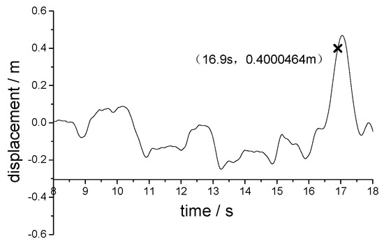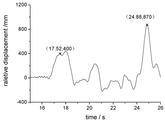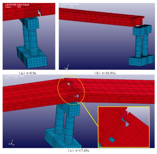 Besides, the bridge specimen of the BC system collapsed under the conditions of the Chi-chi seismic wave input longitudinal with a PGA of 1.2 g (see Figure 10). The specific process is as follows: when t was 8.9 s, the middle bearings failed and caused damage at the bottom of the T beam; when t was 16.91 s, the superstructure was almost detached from the pier, and Figure 11 demonstrated that the relative displacement between the upper and lower structures above 40 cm occurred at this time; when t was 17.45 s, one end of the upper main beam fell down from the cap beam, which could be determined by the collapse of the bridge specimen.