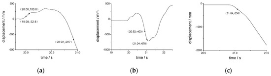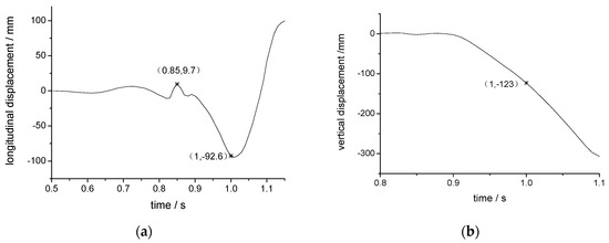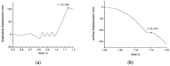 Two typical seismic wave input conditions as mentioned earlier were used to illustrate the collapse characteristics of the CLUC system. Under the action of longitudinal El Centro seismic wave, the bridge model of the CLUC system finally collapsed when the PGA was 1.4 g, as shown in Figure 25. The specific process is as follows: when t was 0.83 s, the middle bearings failed, and the bottom of the middle pier began to be damaged; when t was 0.85 s, tendons were seen at the bottom of the middle pier; when t was 0.93 s, the damage of the bottom of the middle pier was serious and the uncovered tendons were enlarged; when t was 1.06 s, the longitudinal displacement of the top of the middle pier is 3 cm (see Figure 26a), so the bottom of the pier was completely destroyed, and the damage of the bottom of the main beam was aggravated by the loss of the support of the middle pier; when t was 1.26 s, the middle pier collapsed, and the vertical displacement of the pier top reached 31 cm (see Figure 26b). The main girder was seriously damaged, so it could be considered that the bridge model collapsed.