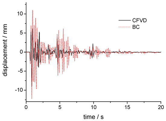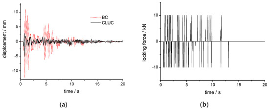 The maximum locking force Fmax is 10 kN, the maximum stroke Dmax is ±190 mm, and the control speed V0 is 0.02 m/s, considering results to be comparable to those of other control systems. In order to prove the rationality of the parameter setting, the El Centro wave case with a longitudinal PGA of 0.4 g was selected for inspection. The peak relative displacement between the side pier and the girder, in this case, was reduced from 12.3 mm of the BC system to 5.1 mm, which showed an isolation rate of 58.5%, illustrated in Figure 23a. The displacement control of the lock-up clutch scheme was better than that of the HDR isolation scheme or the FVD scheme, which was due to the fact that the locking force output was basically switched between “output” or “non-output” (see Figure 23b), which was very different from that of the FVD. Under the same ground motion, the output of the lock-up clutch of the CLUC system was larger than that of the damper of the CFVD system and directly reached the maximum locking force (see Figure 24). Therefore, the displacement response could be controlled more effectively, but the energy dissipation capacity of the lock-up components was poor, and its output effect was similar to that of rigid members. Thus, the contribution of the lock-up clutch to energy consumption is usually not taken into account.