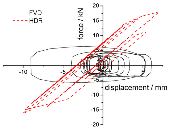 The HDR bearing is a kind of seismic isolation rubber bearing in which the damping of the material is increased by improving the formula of the rubber on the basis of the conventional rubber bearing, so as to exert the seismic-absorbing effect of the isolation rubber bearing. It combines vertical bearing capacity, horizontal restoring force, and damping. The initial elastic stiffness can have a braking effect on wind load, which is similar to plate rubber bearing, and the bearing plays the role of damping and energy dissipation when large displacement occurs. On the one hand, it maintains the good mechanical properties of plate rubber bearing, and it has high damping rubber viscosity and high damping (its damping ratio can be about 0.15), so it can absorb seismic energy and reduce seismic response in an earthquake. Based on its good isolation characteristics, it can be further designed to control the collapse of the structure. The earthquake damage of the bridge can be effectively reduced by utilizing the comprehensive performance of the HDR bearing [41]. In addition, the cost of HDR bearings is not high, the environmental impact is small, and the damping is less influenced by the temperature [42]. Therefore, HDR bearing research is also ongoing in recent years.
