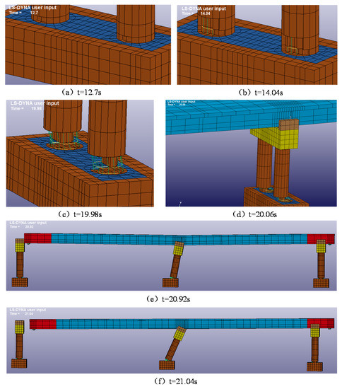 The bridge specimen of the CFVD system would collapse if the Chi-chi seismic wave input longitudinally with a PGA of 2.8 g, as shown in Figure 21 The specific process is as follows: when t was 12.7 s, the bottom of the middle pier was damaged; when t was 14.04 s, damage of the bottom of the middle pier reached the bare steel bar; when t was 18.1 s, the bottom of the side pier was damaged; when t was 19.96 s, the bottom of the middle pier was seriously damaged, and tendons were exposed at the bottom of the side piers which bearings began to slide; when t was 19.98 s, the longitudinal displacement of the top of the middle pier reached 3.3 cm (see Figure 12a) and the bottom of the middle pier was completely invalid; when t was 20.06 s, the middle pier fell, the main girder was bent down and the bottom of the beam was damaged; when t was 20.92 s, the main beam was separated from the side pier on the left and the dampers had also withdrawn from work; when t was 21.04 s, the main beam was only supported by the side pier on the right, with longitudinal relative displacement of the side pier and the beam of 67 cm, and the main beam was falling to collapse, as shown by Figure 21f and Figure 22b,c.