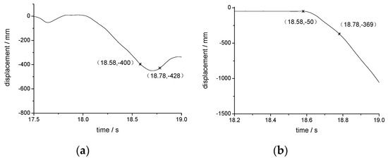 Under the action of the longitudinal Chi-chi seismic wave, the bridge specimen of the CLUC system eventually collapsed with a PGA of 1.8 g, as exposed in Figure 27. The specific process was: when t was 16.6 s, the middle pier at the bottom was slightly damaged; when t was 16.86 s, the bottom of middle pier started to leak reinforcement; when t was 17 s, the damage at the bottom of the middle pier was aggravated, and the front and back of the pier column were all leaking bars, thus the damaged part was almost connected into a circle; when t was 17.02 s, the displacement of the top of middle pier was increased to 3.2 cm, and the middle pier failed completely; when t was 18.16 s, bearings on the side pier were sliding; when t was 18.34 s, the locking device failed for it exceeded the maximum stroke of 190 mm; when t was 18.58 s, the main beam moves longitudinally away from the left side pier; when t was 18.78 s, the middle pier was continuously swinging, with peak longitudinal displacement of 43 cm and peak vertical displacement of 18 cm (see Figure 28). At this time, the longitudinal spacing of the left side pier and girder was 37 cm (see Figure 29a), which meant the main beam separated from the left side pier. Therefore, only the right side pier was still supporting the superstructure, resulting in the overall instability of the bridge. It could be seen from Figure 29b that the main beam was falling downward continuously. So the bridge specimen of the CLUC system was collapsed.