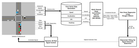 Figure 1 shows the overall architecture of the proposed dynamic all-red signal control system. The first step of the process begins with traffic data collection from the intersection traffic environment. Traffic data to be collected includes traffic signal as well as all incoming vehicles’ movement data such as each vehicle’s speed, acceleration, distance to the intersection (DTI) and headway during a certain time duration. Note that, for the purpose of all-red signal length control, the system requires traffic data measured while the traffic signal is in the yellow state. The next step of the process is to identify which incoming vehicles are likely to be RLR. As shown in Figure 1, we use the MC-DCNN classifier for this purpose. The proposed MC-DCNN classifier classifies not only whether an incoming vehicle is likely to be an RLR or not but it also classifies into several different types of RLR based on the vehicle’s driving characteristics if the vehicle is likely to be an RLR. Then the last step of the process is to determine the length of all-red signal extension based on the detailed classification result from the MC-DCNN. For this step, we use a multi-level regression approach consisting of the Hougen–Watson nonlinear regression and a quadratic polynomial fitting to determine the necessary all-red signal extension time. More details on each of the steps in the process are covered in the following sections.