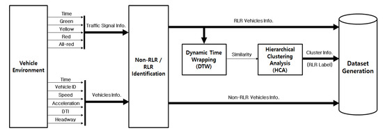 Figure 2 shows the overall procedure for dataset generation. The data collected from the traffic environment includes traffic signal data, vehicle movement data, and also whether each vehicle is RLR or non-RLR. In the collected raw traffic data, RLR vehicles are not distinguished according to their characteristics. Therefore, clusters for each RLR characteristic are generated through Dynamic Time Wrapping (DTW) and Hierarchical Clustering Analysis (HCA) processes. After this process, a dataset for training MC-DCNN is constructed based on the traffic data together with RLR cluster labels so that each vehicle in the dataset is now labeled with a cluster ID according to its driving characteristics.