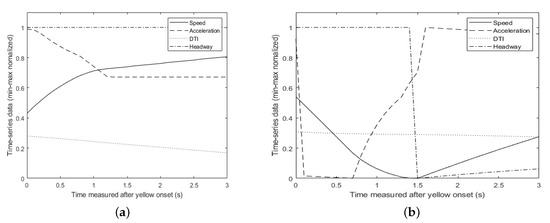 At an intersection, a vehicle’s speed profile changes dramatically in response to traffic signals. Vehicles with no intention of signal violations and RLR vehicles typically show different movement from the start of the yellow signal [23]. Furthermore, it is well known that the speed profile of a vehicle represents the driving pattern of the vehicle and also reflects various factors affecting the vehicle motion such as driving condition and driving style [24,25]. As an illustration of how other factors affect the speed profile of a vehicle, Figure 3 shows a comparison between driving profiles of two different RLR clusters. Figure 3a shows a pattern in which the speed and acceleration are maintained without significant change after 1 s of yellow onset. The DTI shows a decreasing pattern because it is moving toward the intersection. The headway has a value of 1, which means that there is no preceding vehicle. On the other hand, the headway shown in Figure 3b changes from 1 to 0 around 1.5 s after the yellow onset. This means that a preceding vehicle suddenly appeared in front of the vehicle from the other lane. With its influence, the speed and acceleration of the RLR decreases rapidly and then increases as the headway increases again.