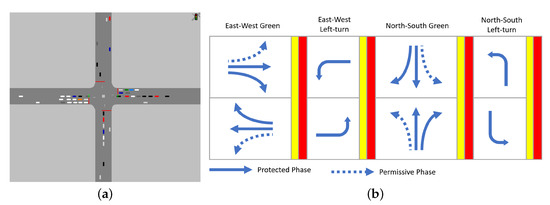 Figure 4. Intersection traffic simulation in Vissim. (a) Simulated intersection traffic; (b) Traffic signal phase.