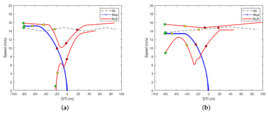 Figure 3. Comparison of driving profiles from two different Red Light Runner (RLR) clusters. (a) Speed maintenance pattern; (b) Acceleration after deceleration by the preceding vehicle pattern.