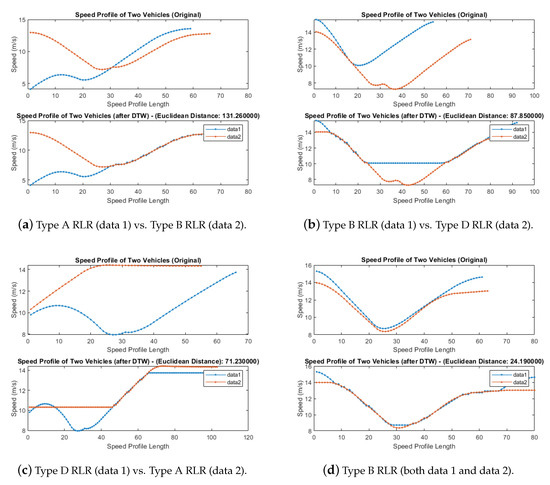 As described in Section 4.1, we use the DTW algorithm to measure the similarity between a pair of speed profile time-series. Figure 6 shows several examples of speed profile time-series data, selected from different clusters which are determined later through the HCA clustering process, to illustrate the effect of the DTW algorithm for optimal alignment of two time-series data and the similarity measure calculated between them. Figure 6a shows a comparison between speed profiles from Type A RLR and Type B RLR clusters. The similarity measure between these two time-series data, calculated as the accumulated pairwise Euclidean distance, is 131.26 in this case. Similarly, Figure 6b,c also show the similarity results from different RLR clusters where similarity measures calculated from the DTW algorithm are 87.85 and 71.23, respectively. On the other hand, Figure 6d shows the similarity result between a pair of speed profile time-series selected from the same cluster, which is Type B RLR in this case. For these speed profile time-series data, the similarity measure from the DTW algorithm is less than 25, which is substantially lower than the other three cases in the figure and hence clearly indicates that these two time-series are quite similar to each other in terms of their shapes while they may be in slightly different phases.