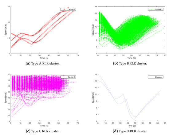 Figure 7 shows the result of clustering generated through the HCA process for all RLR traffic data collected from the Vissim simulation. Figure 7a–d shows RLR speed profiles of each cluster. As shown in the figure, four RLR clusters show different driving characteristics where RLR in Type A keeps accelerating to cross an intersection, RLR in Type B first decelerates and then accelerates, RLR in Type C is mostly maintaining its speed, and finally, RLR in Type D exhibits similar behavior as Type B in the beginning but decelerates rapidly shortly after accelerating due to the sudden appearance of a proceeding vehicle in front of the RLR.