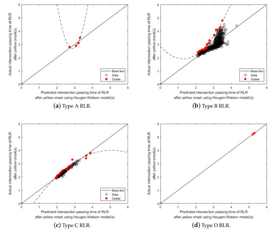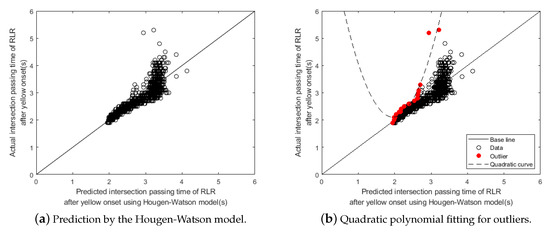 Figure 8 shows the comparison between the actual intersection passing time calculated from the traffic data and the predicted intersection passing time by the Hougen–Watson prediction model for all RLRs traffic data. In the figure, circular points represent RLRs. For each RLR, the actual and the predicted intersection passing times for the vehicle can be compared between the values in the vertical and horizontal axis. The diagonal line, called the Base line in the figure, represents when the actual and predicted time matches. Thus RLRs above the base line actually take longer time than the predicted intersection passing time to completely cross an intersection. As shown in the figure, a large number of RLRs are shown above the base line. Therefore, for such RLRs, the Hougen–Watson prediction model alone is not enough to predict the necessary all-red signal extension time for all types of RLRs. To address this issue, we identified RLRs, called the Outliers, from the dataset in which actual intersection passing times are larger and also maximally deviated from their predicted intersection passing times. In Figure 8b, red colored circular points represent those outliers identified from the dataset and the dashed line represents the quadratic polynomial curve fitted to the outliers. Hence, if we use the quadratic curve model on top of the Hougen–Watson model to predict the intersection passing time, then the predicted time will be long enough for most RLRs so that they can completely clear an intersection within the time interval, which is much safer than using the Hougen–Watson model alone.