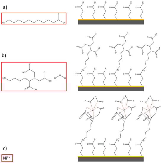 Gold-coated chips were immersed in a 10 mM solution of 11-mercaptoundecanoic acid in ethanol (EtOH) overnight (ON) at room temperature (RT). Then, the substrates were rinsed with EtOH in order to remove MUA molecules not bound to the surface and dried with nitrogen (Figure 1a). The activation and amidation of the carboxylate groups on Au-MUA substrates were carried out in a double step process: firstly, the samples were exposed to 100 mM N-(3-Dimethylaminopropyl)-N′-ethylcarbodiimide hydrochloride (EDC) and 20 mM N-Hydroxysulfosuccinimide (NHS) aqueous solution for 1.5 h at RT. Then, they were immersed in 40 mM Nα,Nα-Bis(carboxymethyl)-L-lysine hydrate (NTA-lysine) aqueous solution (2 h at RT). Finally, the substrates were thoroughly rinsed with 150 mM NaCl and 10 mM HEPES aqueous solution (Figure 1b). The amino-nitrilotriacetic-Ni(II) complex (NTA-Ni2+) was formed by reaction of Au-MUA-NTA-lysine with nickel(II) chloride (1 mM) in 150 mM NaCl and 10 mM HEPES buffer pH 7.4 (2 h at RT) (Figure 1c).