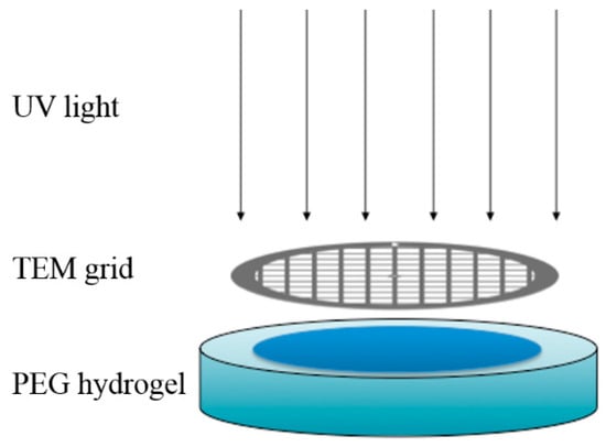 Acryl-PEG-Anti-GFP photo-crosslinking on PEG hydrogel using a selective mask. The functionality of acrylic groups on Acryl-PEG-Anti-GFP complex was assessed by photo-crosslinking, a hydrogel dish [30]. Briefly, a solution of Acryl-PEG-Anti-GFP 20 nM and Darocur® 1173 (0.3% w/v) was irradiated to conjugate the antibody to the hydrogel. A TEM grid was used as UV photomask to direct the radiation in limited and defined areas, and consequently to have a selective photopolymerization (Figure 2). Irradiation with a 365 nm UV light at 2 mW cm−2 for 3 min was performed. During UV irradiation, the grid was in contact with the hydrogel to limit UV light diffraction due to air gap [31]. The presence of Acryl-PEG-Anti-GFP on the hydrogel was then visualized through a secondary FITC-conjugated antibody (Alexa Fluor® 488 anti-chicken, Thermo Fisher Scientific), incubated for 1 h at RT (1:250).