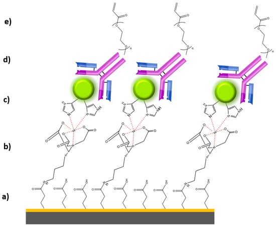 The scheme shows the steps of the site-directed functionalization of the antibody. (a) Coating of the gold surface with the organic acid MUA; (b) binding of NTA-lysine and complexation with Ni2+; (c) functionalization with the His-tagged antigen. (d) The immobilized protein was recognized by the target antibody. (e) Finally, the constant fraction of the antibody was functionalized with Acryl-PEG-NHS.