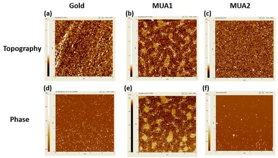 First, the gold surfaces (1 cm2) were derivatized with MUA at different incubation times and imaged by NC-AFM. The derivatization of gold for 12 h induces the formation of domains due to the partial coverage of the substrate with the thiol group of the organic acid (Figure 4b) as also shown by phase images (Figure 4e). Indeed, being sensitive to the chemical composition of the surface groups, it confirmed the formation of MUA domains on the gold surface [32]. Moreover, the AFM analysis shows the presence of occasional peaks of few nanometers attributable to the formation of molecular aggregates, likely induced by the interactions between the alkyl chains ending to thiol aggregates [33].