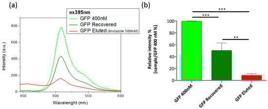 (a) Fluorescence emission spectra and relative intensity percentage of green fluorescent protein (GFP) solutions of solutions (excitation 395 nm, emission 508 nm) as quantitative estimation of the protein recovered after incubation (dark green curve) and eluted from the solid support (red curve) compared to the feeding solution of GFP (light green curve) (b). The quantitative values have been averaged over 3 measurements. Error bars represent standard deviation (SD) (*** p < 0.001, ** p < 0.01).