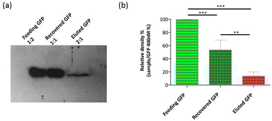 Western blot analysis (a) and relative density percentage (b) performed on the feeding solution of GFP (light green bar), GFP recovered after incubation (dark green bar), and GFP eluted from the solid support (red bar). The reported values have been averaged over 3 measurements. Error bars represent standard deviation (SD) (*** p < 0.001, ** p < 0.01).