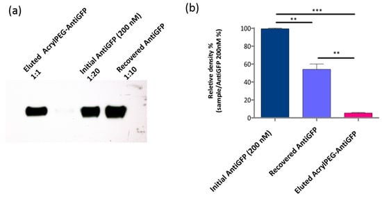 The next functionalization step consists in the binding of the antibody to the immobilized antigen followed by the conjugation of Acryl-PEG to the Fc fragment of the antibody via EDC chemistry. Once the directional binding of Acryl-PEG to the antibody was complete, the PEG-Anti-GFP complex had to be detached from the substrate to proceed toward the development of the PEG hydrogel by breaking the Ag-Ab pair. The specific binding between antigens and antibodies involves weak interactions, i.e., ionic bonding, hydrogen bonding, and van der Waals attractions. The strength of Ag-Ab complexes depends on the relative affinities and avidities of the antibodies [29]. To dissociate the Ag-Ab binding and to recover the antibody at a high yield, purity, and stability, an elution buffer containing 0.1 M glycine-HCl pH 2.8 was used. Afterwards, the complex PEG-Anti-GFP was quantified by WB. Panel (a) of Figure 7 reports the WB analysis, while panel (b) shows the relative density percentage of the eluted Acryl-PEG-Anti-GFP complex compared to that of the recovered Anti-GFP and the initial amount of Anti-GFP 200 nM added to the substrate.