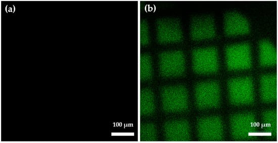 Confocal microscopy images of PEGDA hydrogel (a) and PEGDA hydrogel functionalized with Acryl-PEG-Anti-GFP (b) stained with Alexa Fluor® 488 anti-chicken. Scale bars are 100 µm.