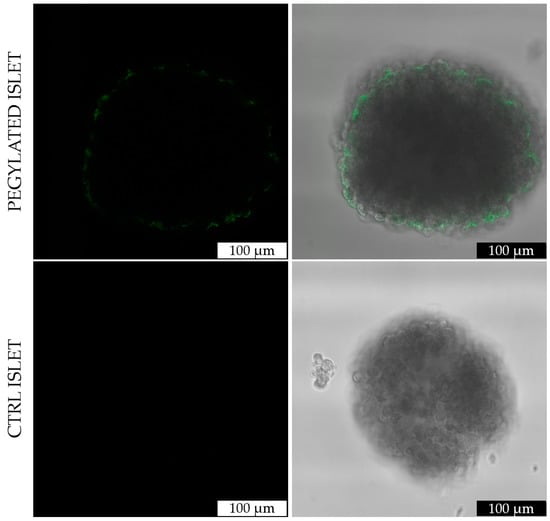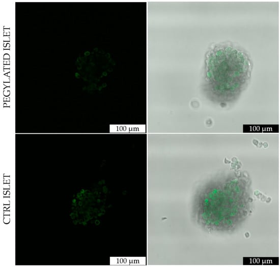 Confocal microscopy images of viable PEGYLATED (upper panels) and CTRL (lower panels) islets. The viability was qualitatively detected with the fluorescein diacetate (FDA) versus propidium iodide (PI) staining method 24 h post functionalization. Scale bar = 100 µm.