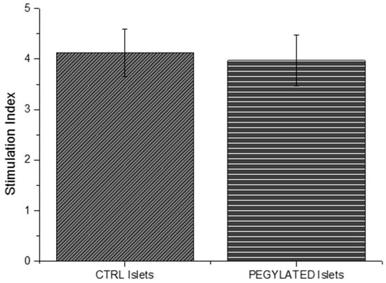 Moreover, the cellular functionality of the islets, in terms of response to glucose, was measured via a glucose-stimulated insulin secretion (GSIS) assay in vitro 24 h post-encapsulation. For all experiments, the insulin stimulation from basal to stimulated levels illustrated the expected response, with stimulated levels higher than basal ones. As shown in Figure 11, the insulin stimulation index was about 4, both for control and encapsulated islet, which, therefore, did not show significantly different behaviors. Therefore, the insulin secretion capacity of encapsulated islets in vitro was maintained compared to control islets.
