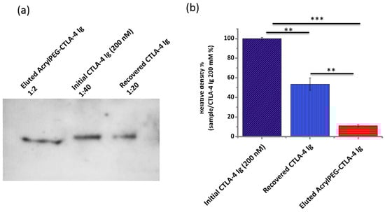 Western blot analysis (a) and relative density percentage (b) of mother solution of CTLA-4 Ig (dark blue bar), CTLA-4 Ig recovered after incubation (light blue bar) and Acryl-PEG-CTLA-4 Ig complex eluted from the solid substrate (red bar). Reported values have been averaged over three measurements. Error bars represent standard deviation (SD) (*** p < 0.001, ** p < 0.01).