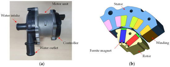 Electric water pump system: (a) configuration and major components; (b) basic motor unit.