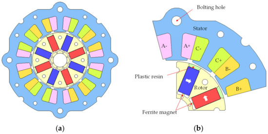 - Kim, J.-M.; Chai, S.-H.; Yoon, M.-H.; Hong, J.-P. Plastic Injection Molded Rotor of Concentrated Flux-Type Ferrite Magnet Motor for Dual-Clutch Transmission. IEEE Trans. Magn. 2015, 51, 1–4. [Google Scholar] [CrossRef]