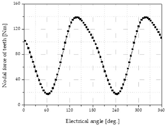 Figure 6 shows a nodal force waveform applied to teeth under rated load conditions, and Table 3 shows a nodal force component along the x-axis and y-axis. As shown in Table 3, the y-axis directional component of the nodal force is greater than the x-axis component.