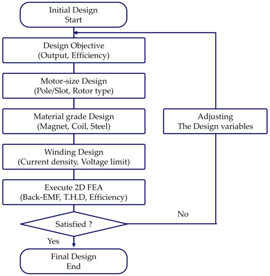 The permanent magnet synchronous motor (PMSM) is widely used in the electric vehicle and domestic appliance industries. The structure of the PMSM motor varies depending on the permanent magnet arrangement in the rotor structure; among them, the interior permanent magnet (IPM) PMSM motors made by inserting permanent magnets into rotors have advantages in applications requiring high output power and high efficiency at load condition [1,2,3,4]. In particular, IPM type motors have saliency depending on rotor shape. Because of, reluctance torque components can be obtained in addition to magnetic torque components. Thus, the total torque of IPM PMSM motors is higher than that of surface permanent magnet (SPM) PMSM motors, which comprise only magnet torque [5,6,7,8,9].