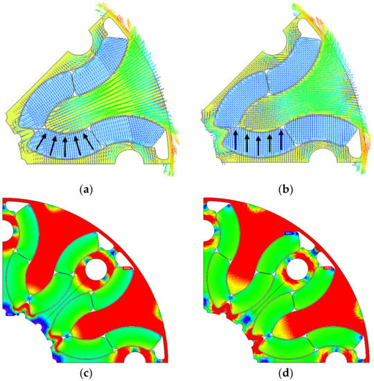 Figure 9 shows the magnetization pattern of the proposed flared type IPM model. As shown in Figure 9a,b, the proposed flared type IPM model can have two different patterns (parallel and radial directions) and the magnetization pattern of the permanent magnet can determine the manufacturing process of the permanent magnet. The magnetic flux density distribution inside the rotor resulting from each magnetization pattern is different, as shown in Figure 9c,d, and the radial magnetization pattern has the advantage that the magnetic flux is more concentrated than in the parallel magnetization pattern. In this paper, characteristic analysis was performed on two patterns to determine the pattern of magnetization. Finally, we applied the radial magnetization pattern to improve performance and reduce torque ripple. Table 4 shows the magnet specifications of the conventional spoke model and the proposed flared model. As shown in Table 4, the total use of permanent magnets in the initial model and in the proposed model is the same. This means that there is no increase in material cost due to permanent magnets. Although, the proposed flared type rotor structure is composed of a number of magnets compared to the basic IPM model so the assembly cost can increase in the manufacturing process. However, it can be improved by using the assembly automation technology.