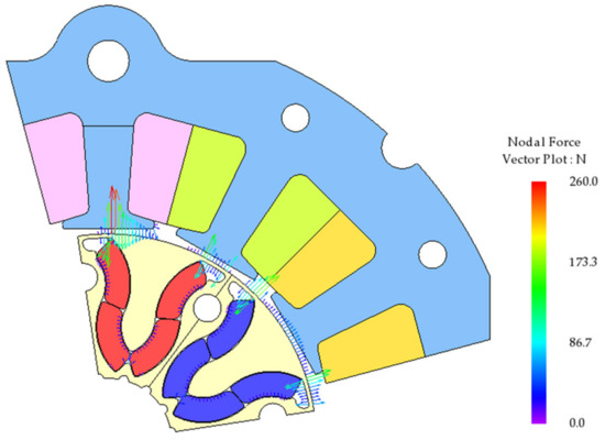Figure 5 shows the nodal forces that are applied to the stator teeth of the basic spoke type IPM motor. When the rotor is rotated, the nodal force in the teeth region has two components. As shown in Figure 5, it has the x-axis components along the direction of rotation and y-axis components perpendicular to the direction of rotation. In particular, the y-axis component is perpendicular to the electromagnetic force, which is the main cause of noise vibration [24,25].