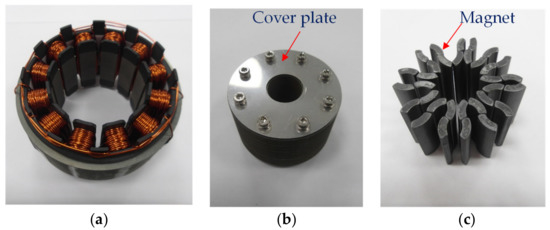 To verify the performance improvement of the proposed flared IPM model, a real prototype was produced and studied. Figure 17 shows the prototype for the proposed flared IPM model. Figure 17a shows stator assembly, Figure 17b shows the rotor assembly, and Figure 17c shows the permanent magnet arrangement inside the rotor assembly. Stator winding was produced by the concentrated winding method. In order to prevent the deformation of the rotor during high-speed rotation, the rotor was manufactured using 8 bolting points. The magnet used 9BE grade ferrite and required 32 magnets.