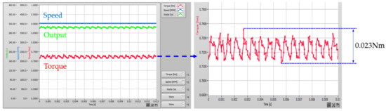 The load test was performed using the prototype. Figure 18 shows the torque waveform at rated load, and Table 10 shows a comparison of the basic spoke type model and the prototype of the proposed flared IPM model. As shown in Figure 18, the experimental results of the proposed flared IPM model were similar compared to the analytical values. Additionally, torque ripple decreased by 66.2%, and efficiency improved by 0.9%. This confirms the performance improvement of the proposed model.
